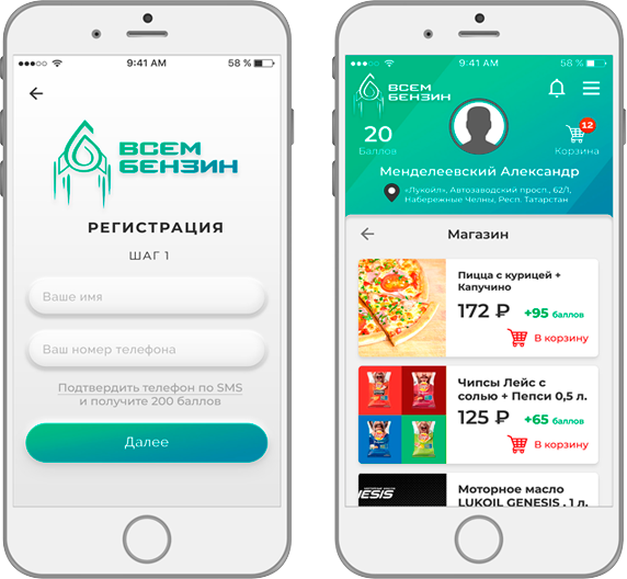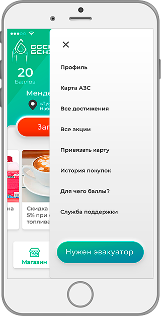Приветственные баллы мотивируют на первую покупку, а PUSH рассылки напомнят что пора заправиться. Реферальная система "сарафанное радио".